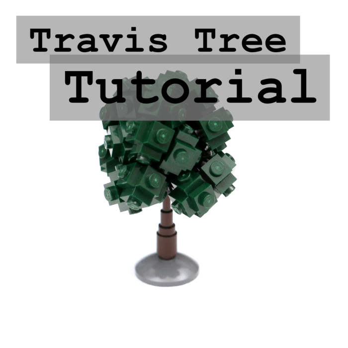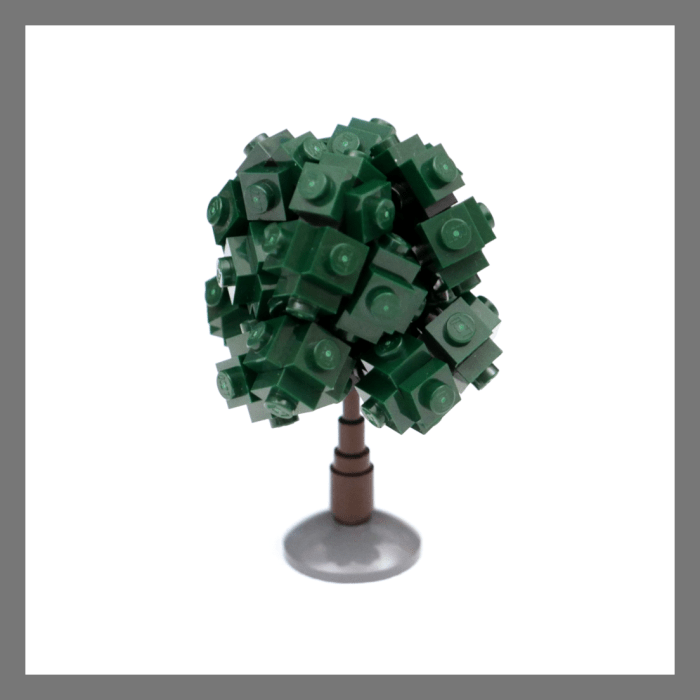 A tutorial showing how to make a tree made mostly out of travis bricks and 1×1 plates in your colour of choice (I went with dark green). It’s quite simple but still has a rather organic shape to it. There is a bit of a pattern in it, but this can be fixed by alternating the angles of the bricks on different sides.