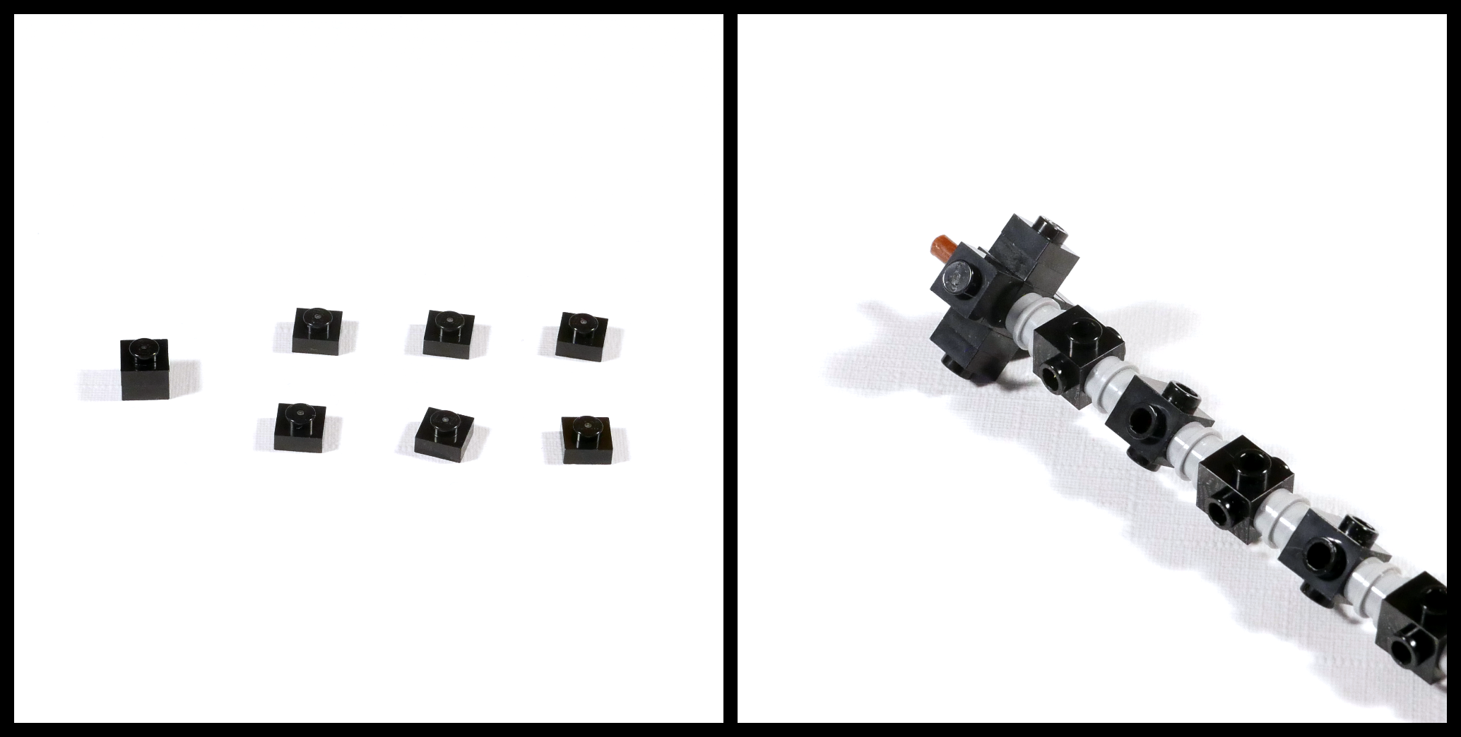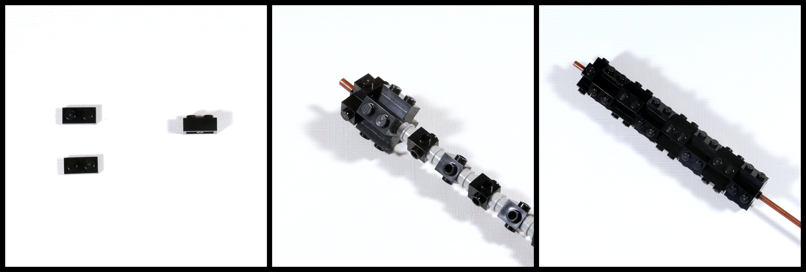 We start by threading on travis bricks and plates on the hose. We put two round plates between each travis brick in order to get a 2 stud interval. We also rotate each travis brick 45 degrees from the previous one. This is how we end up with studs in 8 directions.
